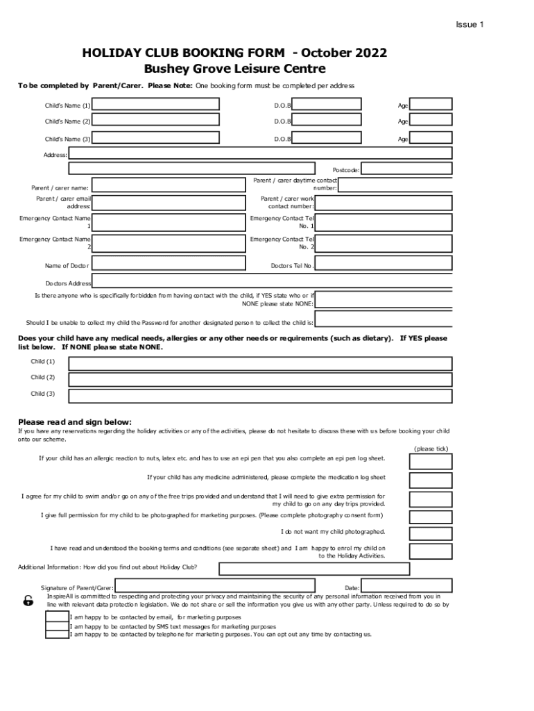Issue 1HOLIDAY CLUB BOOKING FORM October 2022 Bushey Grove Leisure Centre To be completed by Parent/Carer. Please Note: One booking form must be completed per address Childs Name (1)D.O.BAgeChilds