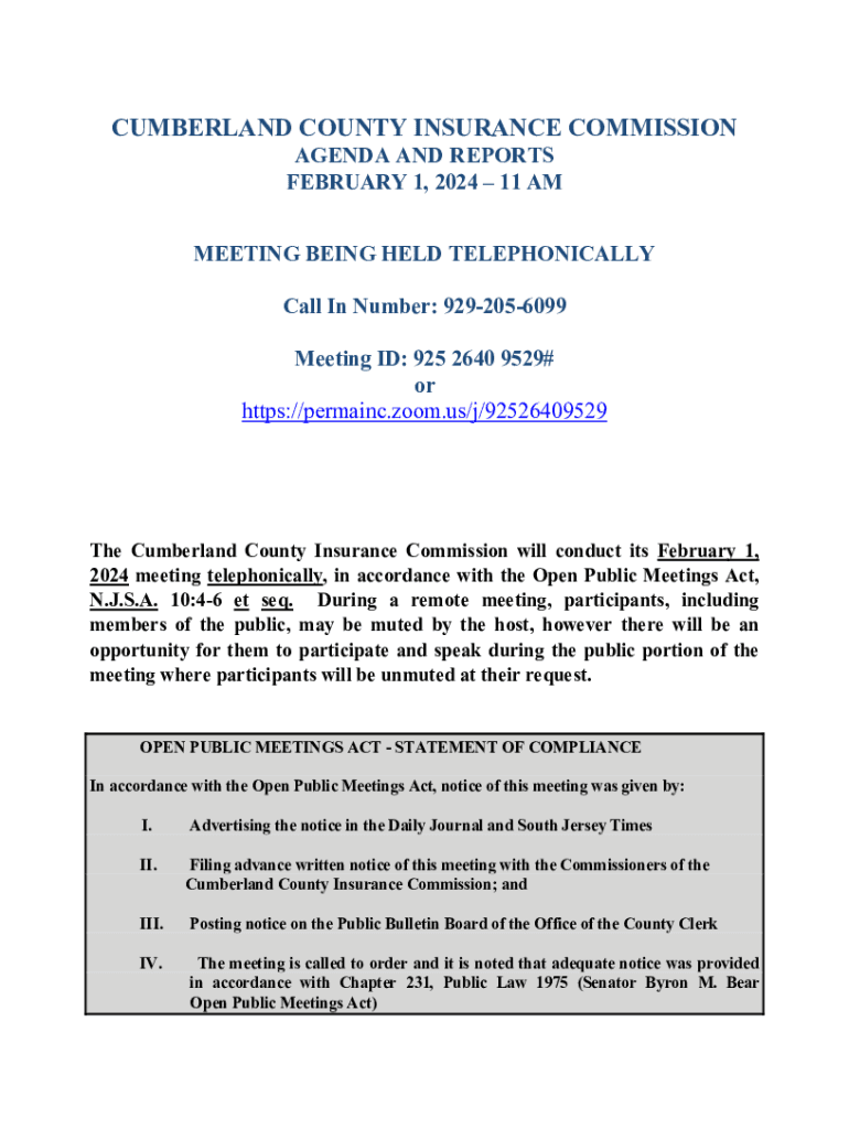 CUMBERLAND COUNTY INSURANCE COMMISSION AGENDA AND REPORTS FEBRUARY 1, 2024 11 AMMEETING BEING HELD TELEPHONICALLY Call In Number: 9292056099 Meeting ID: 925 2640 9529# or https://permainc.zoom.us/j/92526409529The