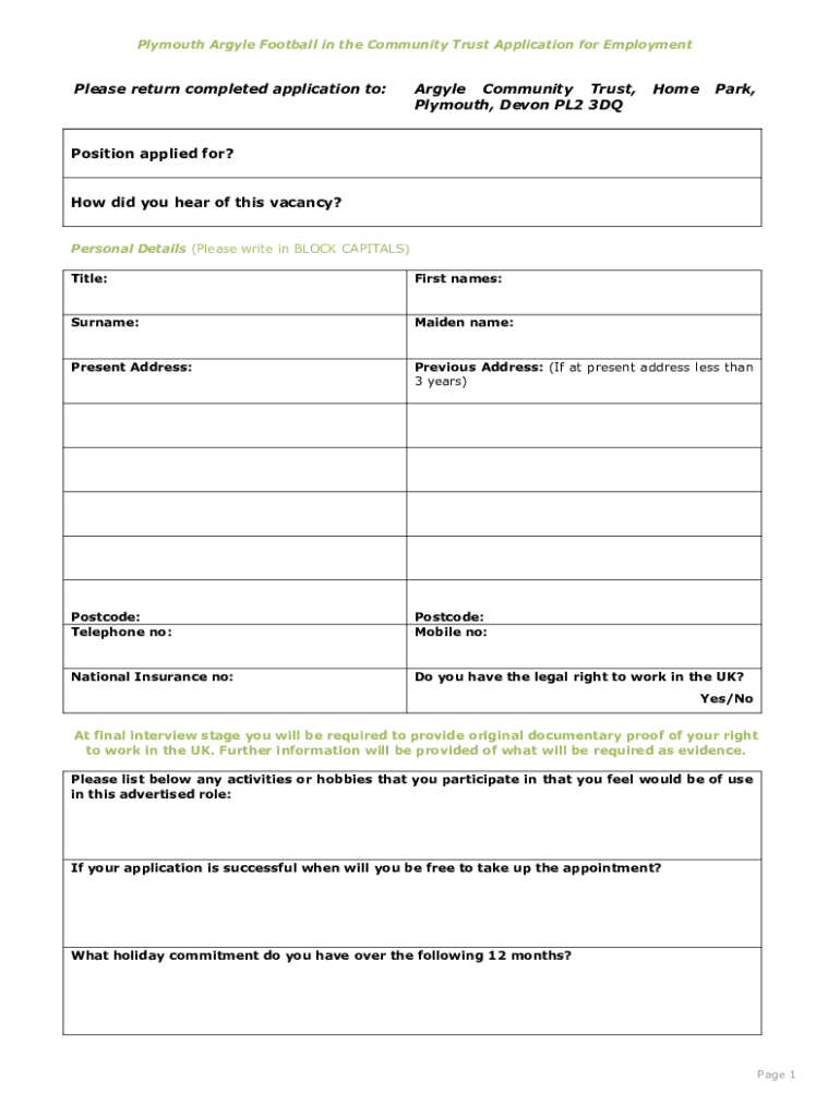 Plymouth Argyle Football in the Community Trust Application for EmploymentPlease return completed application to:Argyle Community Trust, Plymouth, Devon PL2 3DQHomePark,Position applied for? How did