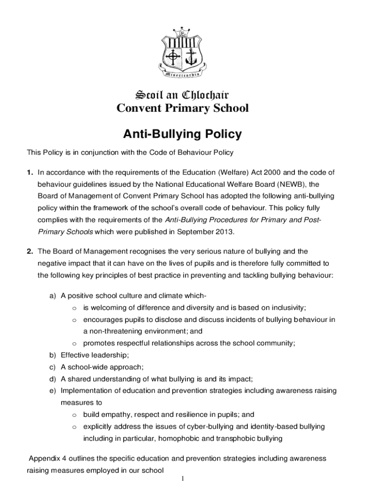 Scoil an Chlochair Convent Primary School AntiBullying Policy This Policy is in conjunction with the Code of Behaviour Policy 1. In accordance with the requirements of the Education (Welfare) Act