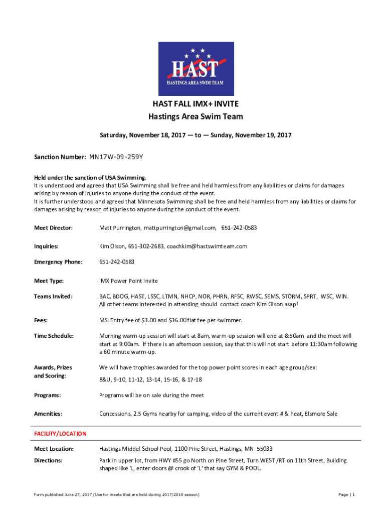 HAST FALL IMX+ INVITE Hastings Area Swim Team Saturday, November 18, 2017 to Sunday, November 19, 2017 Sanction Number: MN17W09259Y Held under the sanction of USA Swimming. It is understood and agreed