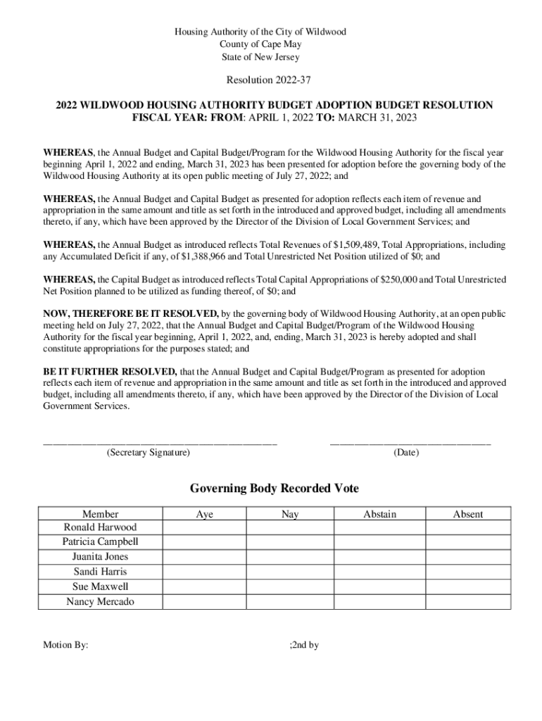 Housing Authority of the City of Wildwood County of Cape May State of New JerseyResolution 202237 2022 WILDWOOD HOUSING AUTHORITY BUDGET ADOPTION BUDGET RESOLUTION FISCAL YEAR: FROM: APRIL 1, 2022