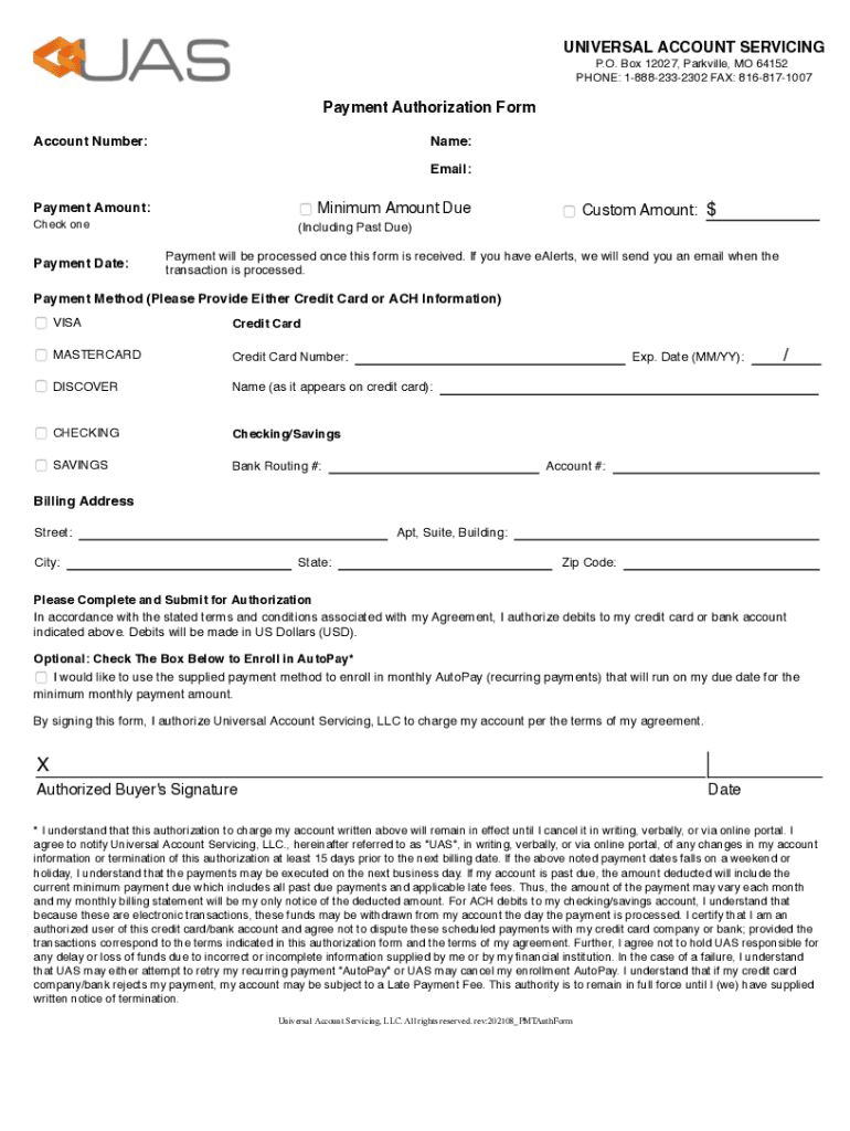 UNIVERSAL ACCOUNT SERVICING P.O. Box 12027, Parkville, MO 64152 PHONE: 18882332302 FAX: 8168171007Payment Authorization Form Account Number:Name: Email:Minimum Amount DuePayment Amount: Check onePayment