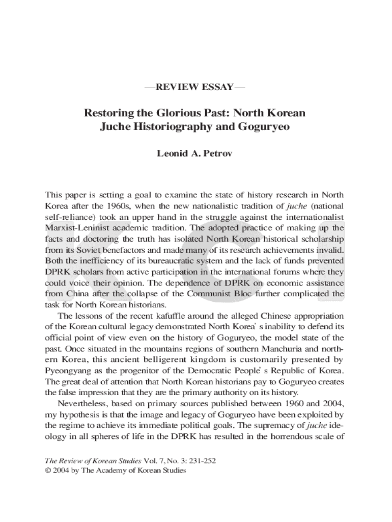 REVIEW ESSAYRestoring the Glorious Past: North Korean Juche Historiography and Goguryeo Leonid A. PetrovThis paper is setting a goal to examine the state of history research in North Korea after the