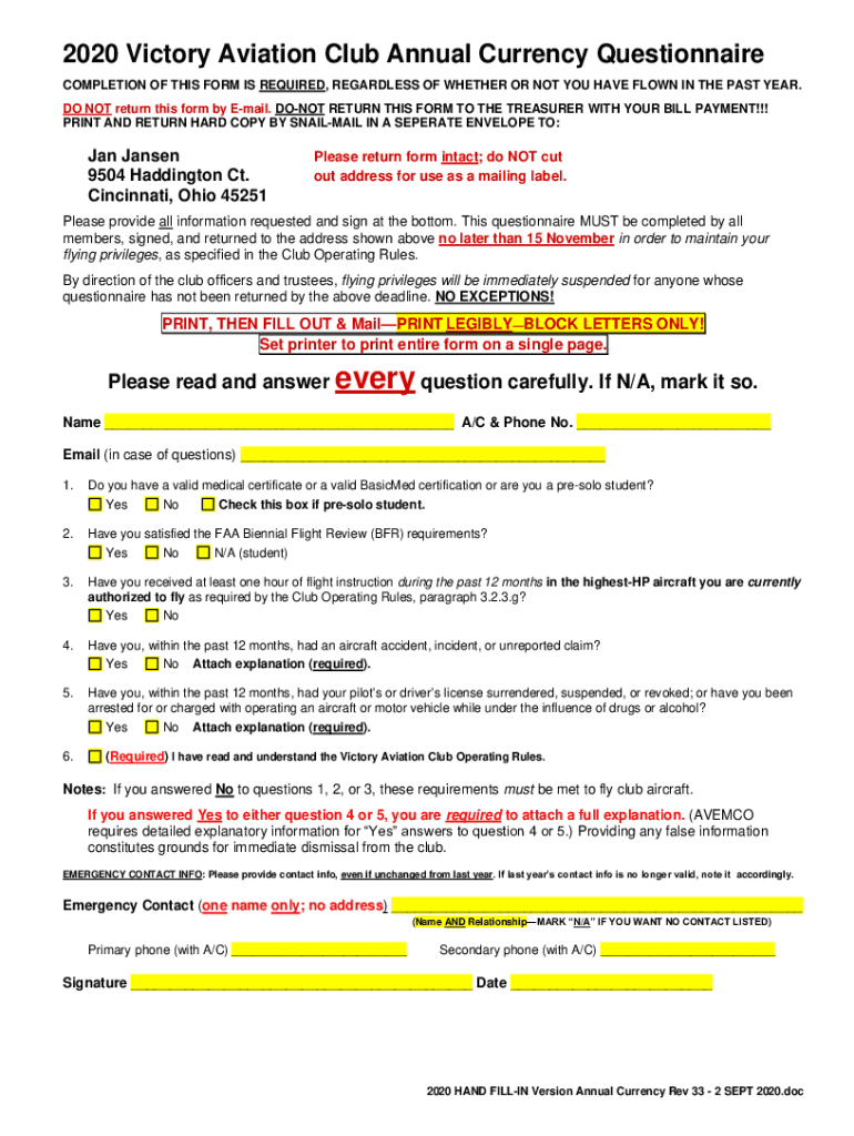 2020 Victory Aviation Club Annual Currency Questionnaire COMPLETION OF THIS FORM IS REQUIRED, REGARDLESS OF WHETHER OR NOT YOU HAVE FLOWN IN THE PAST YEAR. DO NOT return this form by Email. DONOT
