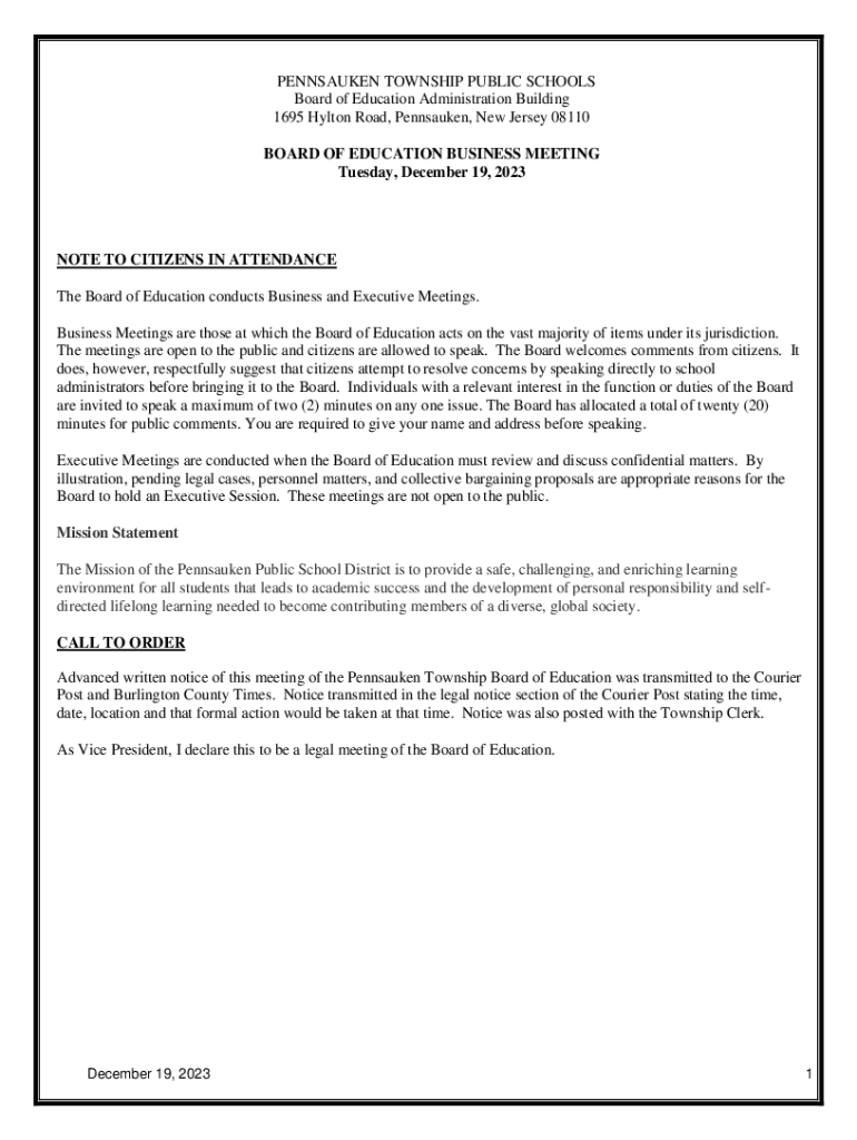 PENNSAUKEN TOWNSHIP PUBLIC SCHOOLS Board of Education Administration Building 1695 Hylton Road, Pennsauken, New Jersey 08110 BOARD OF EDUCATION BUSINESS MEETING Tuesday, December 19, 2023NOTE TO CITIZENS
