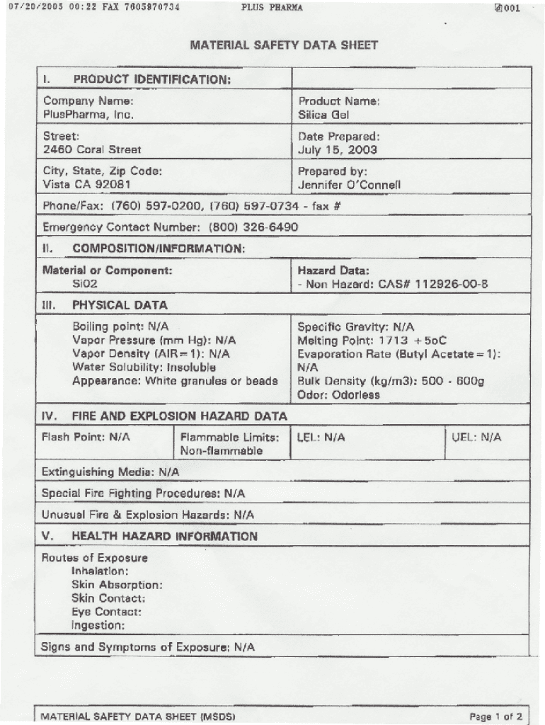 07/20/2005PLUS PHARMA00:22 FAX 7605970734001MATERIAL SAFETY DATA SHEETI.PRODUCT IDENTIFICATION:Company Name: PlusPharma, Inc.Product Name: Silica GelStreet: 2460 Coral StreetDate Prepared: July 15,