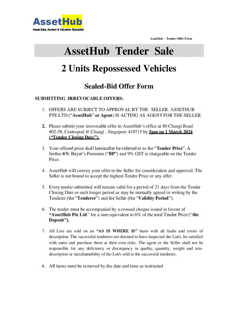 AssetHub Asset Sale, Auction & Valuation SpecialistAssetHub Tender Offer FormAssetHub Tender Sale 2 Units Repossessed Vehicles SealedBid Offer Form SUBMITTING IRREVOCABLE OFFERS: 1. OFFERS ARE SUBJECT
