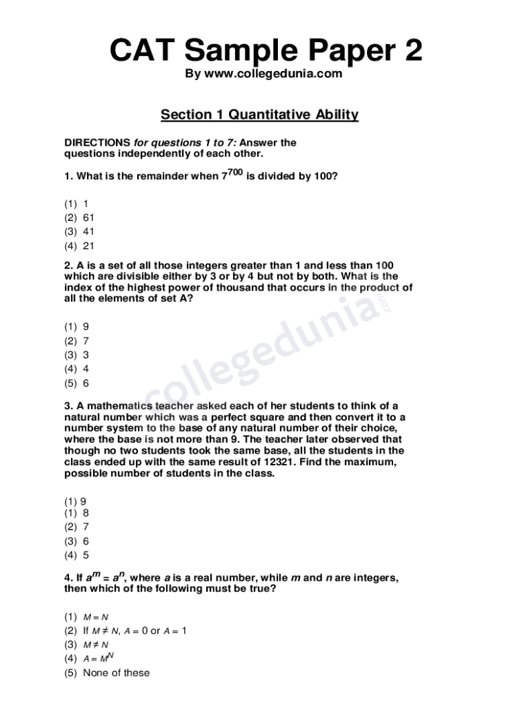 CAT Sample Paper 2 By www.collegedunia.comSection 1 Quantitative Ability DIRECTIONS for questions 1 to 7: Answer the questions independently of each other. 1. What is the remainder when 7700 is divided