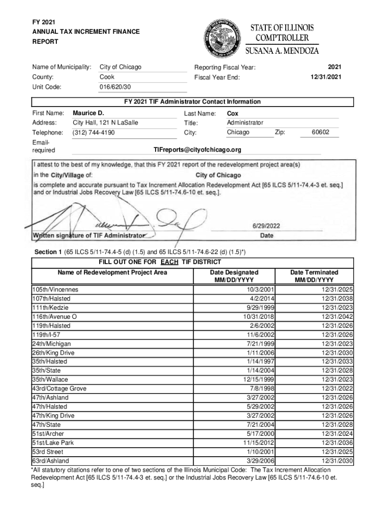 FY 2021 ANNUAL TAX INCREMENT FINANCE REPORTName of Municipality:City of ChicagoReporting Fiscal Year:County:CookFiscal Year End:Unit Code:016/620/302021 12/31/2021FY 2021 TIF Administrator Contact