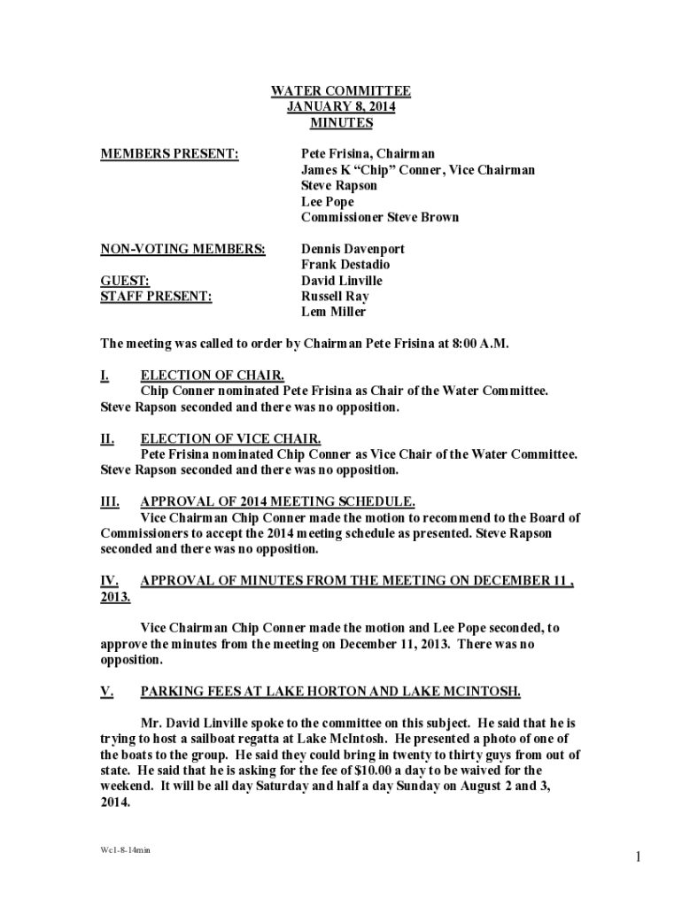 WATER COMMITTEE JANUARY 8, 2014 MINUTES MEMBERS PRESENT:Pete Frisina, Chairman James K Chip Conner, Vice Chairman Steve Rapson Lee Pope Commissioner Steve BrownNONVOTING MEMBERS:Dennis Davenport Frank