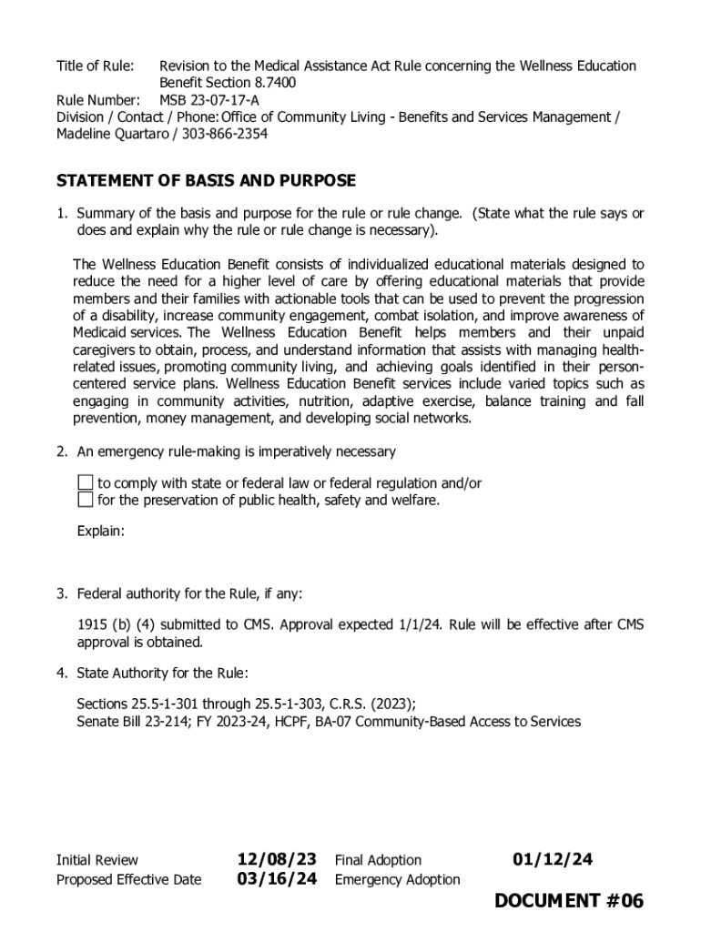 Title of Rule:Revision to the Medical Assistance Act Rule concerning the Wellness Education Benefit Section 8.7400 Rule Number: MSB 230717A Division / Contact / Phone: Office of Community Living Benefits