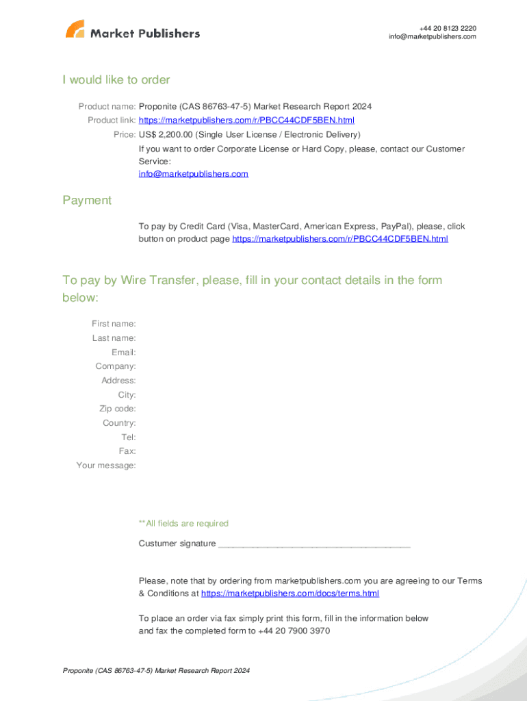 +44 20 8123 2220 info@marketpublishers.comProponite (CAS 86763475) Market Research Report 2024 https://marketpublishers.com/r/PBCC44CDF5BEN.html Date: March 2024 Pages: 50 Price: US$ 2,200.00 (Single