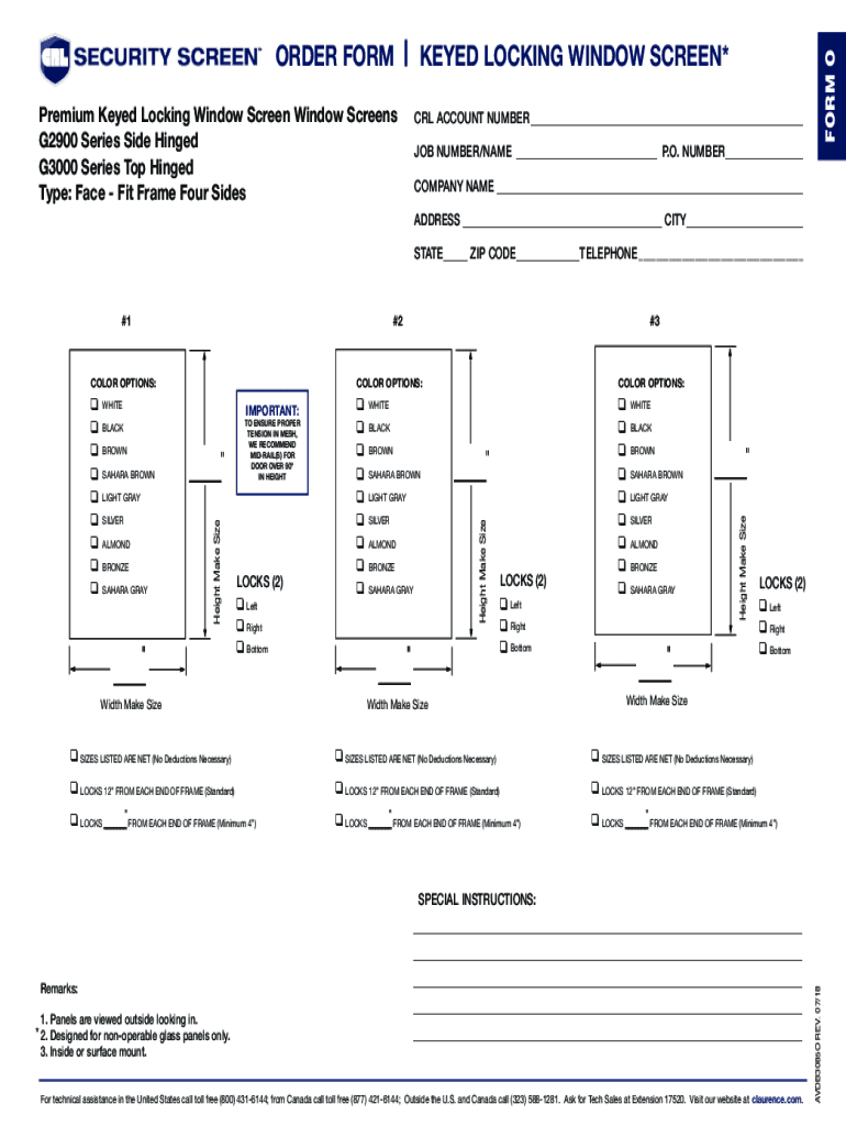 |Premium KeyedLockingWindowScreen Window Screens G2900 Series Side Hinged G3000 Series Top Hinged Type: Face Fit Frame Four SidesKEYEDLOCKINGWINDOWSCREEN* CRL ACCOUNT NUMBER___ JOB NUMBER/NAME___