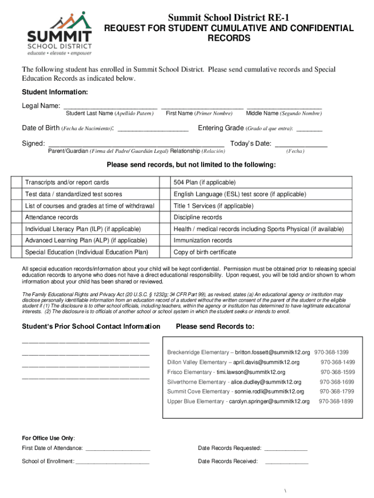 Summit School District RE1 REQUEST FOR STUDENT CUMULATIVE AND CONFIDENTIAL RECORDSThe following student has enrolled in Summit School District. Please send cumulative records and Special Education