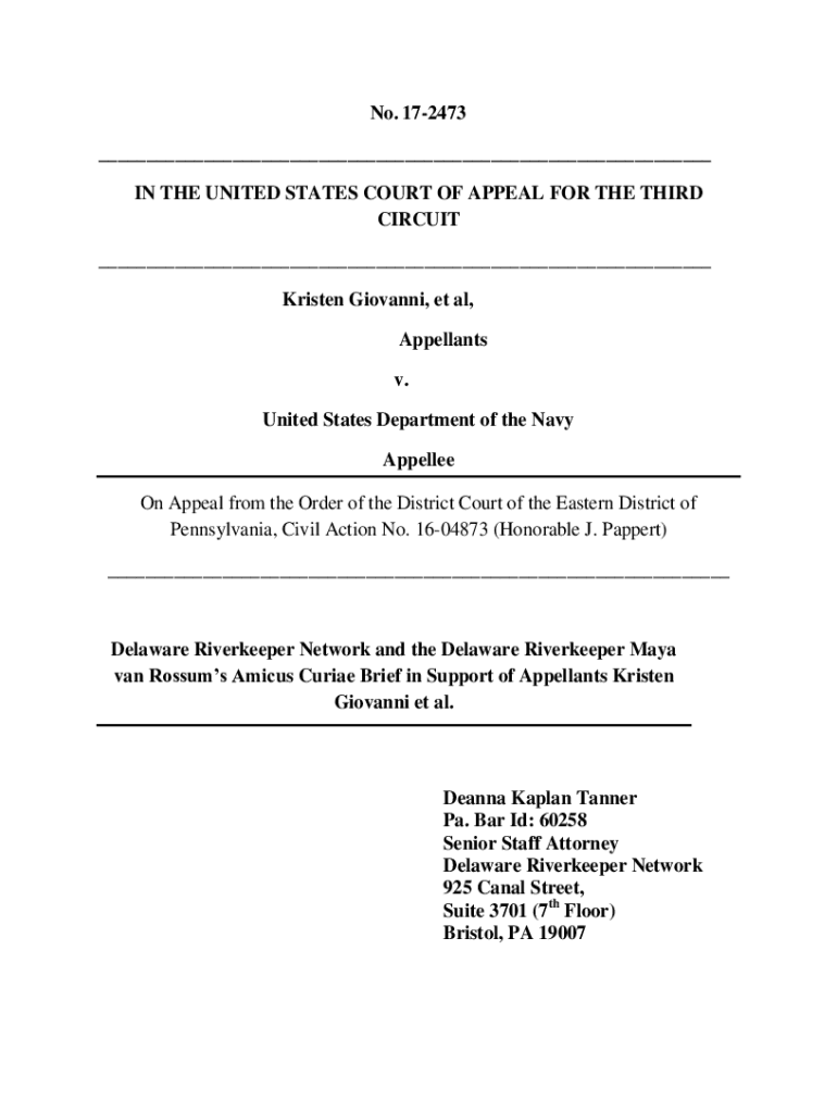 No. 172473 ___ IN THE UNITED STATES COURT OF APPEAL FOR THE THIRD CIRCUIT ___ Kristen Giovanni, et al, Appellants v. United States Department of the Navy Appellee On Appeal from the Order of the District