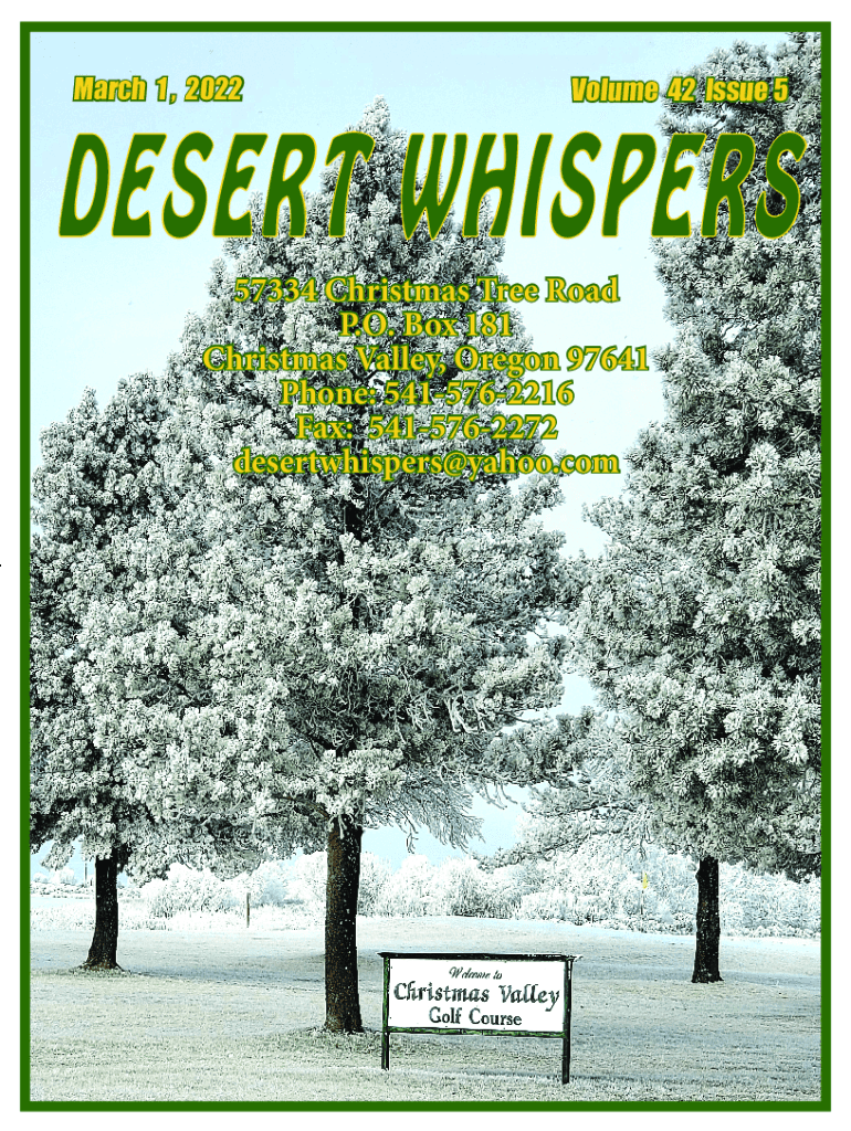 DESERT WHISPERS 1March 1, 2022Volume:42 Issue: 5March 1 , 2022Volume 42 Issue 5DESERT WHISPERS 57334 Christmas Tree Road P.O. Box 181 Christmas Valley, Oregon 97641 Phone: 5415762216 Fax: 5415762272