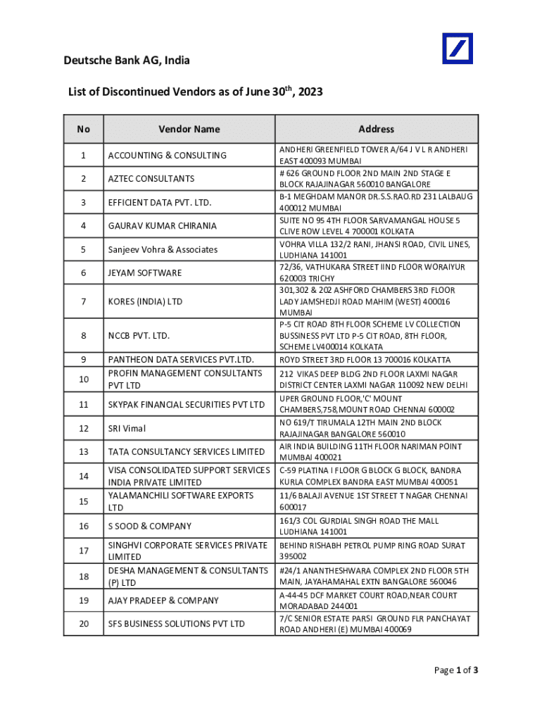 Deutsche Bank AG, India List of Discontinued Vendors as of June 30th, 2023 NoVendor Name1ACCOUNTING & CONSULTING2AZTEC CONSULTANTS3EFFICIENT DATA PVT. LTD.4GAURAV KUMAR CHIRANIA5Sanjeev Vohra & Associates6JEYAM