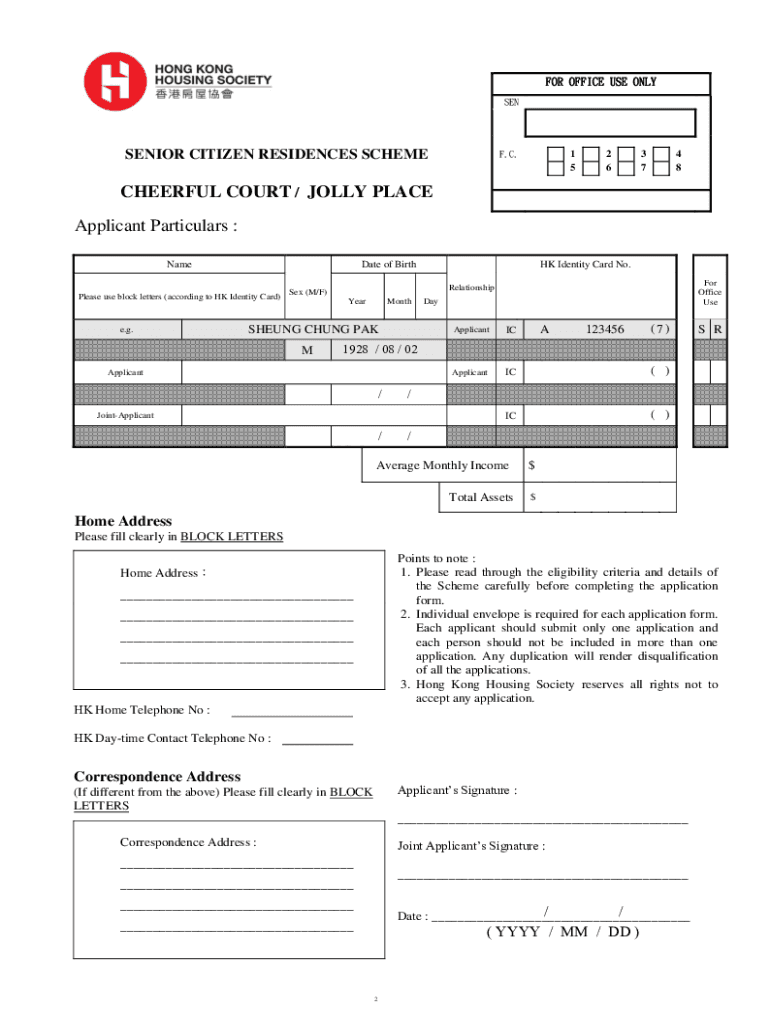 SENIOR CITIZEN RESIDENCES SCHEME CHEERFUL COURT / JOLLY PLACE NGAU TAU KOKTSEUNG KWAN OApplication FormThe completed application form must be mailed to Hong Kong Housing Society, General Post Office