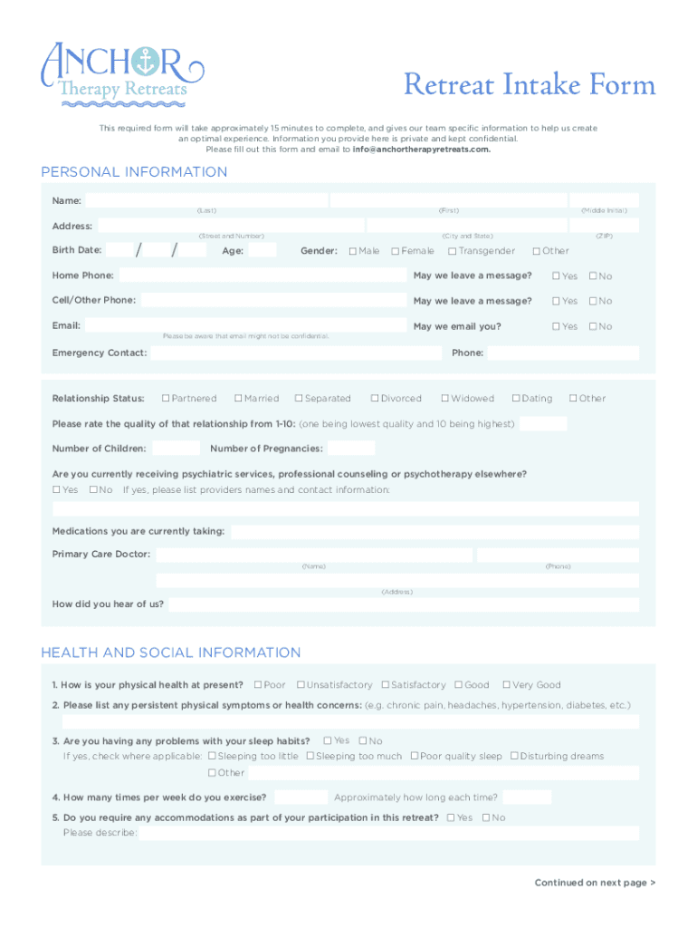Retreat Intake Form This required form will take approximately 15 minutes to complete, and gives our team specific information to help us create an optimal experience. Information you provide here