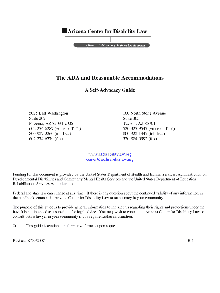 Arizona Center for Disability Law The ADA and Reasonable Accommodations A SelfAdvocacy Guide 5025 East Washington Suite 202 Phoenix, AZ 850342005 6022746287 (voice or TTY) 8009272260 (toll-free) 6022746779
