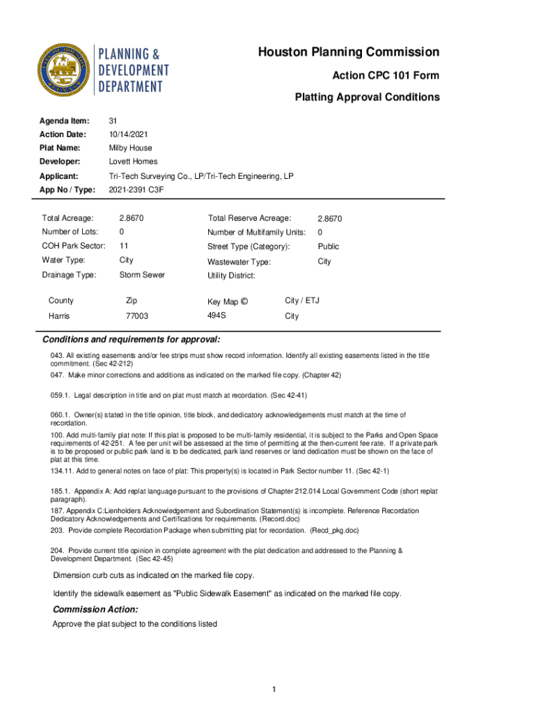 Houston Planning Commission Action CPC 101 Form Platting Approval Conditions Agenda Item:31Action Date:10/14/2021Plat Name:Milby HouseDeveloper:Lovett HomesApplicant:TriTech Surveying Co., LP/TriTech