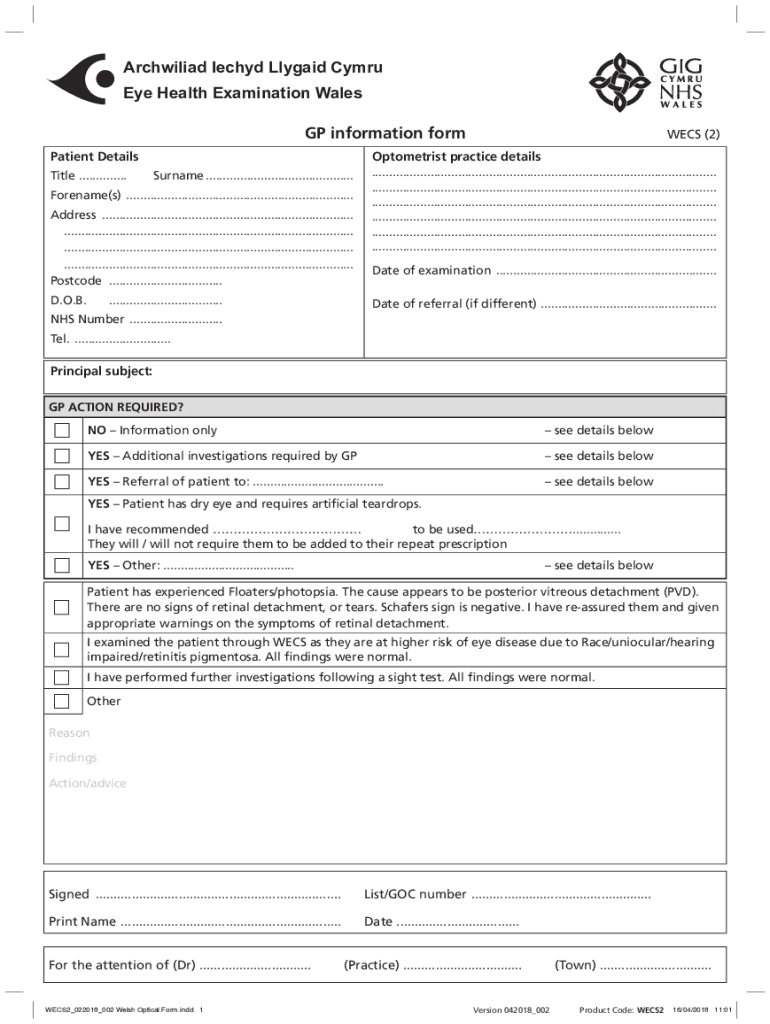 To fill out the Welsh Eye Care Scheme, practitioners must complete a designated form that includes patient details, the nature of the services provided, and any relevant clinical findings.
