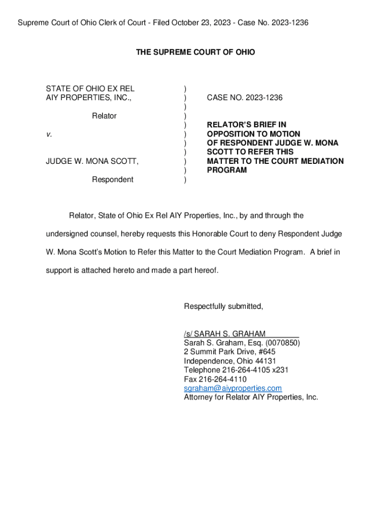 Supreme Court of Ohio Clerk of Court Filed October 23, 2023 Case No. 20231236THE SUPREME COURT OF OHIOSTATE OF OHIO EX REL AIY PROPERTIES, INC., Relator v.JUDGE W. MONA SCOTT, Respondent) ) ) ) )