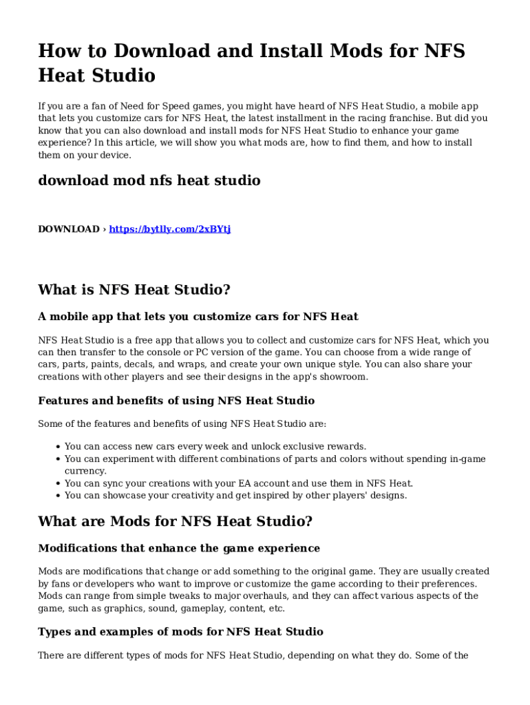 How to Download and Install Mods for NFS Heat Studio If you are a fan of Need for Speed games, you might have heard of NFS Heat Studio, a mobile app that lets you customize cars for NFS Heat, the