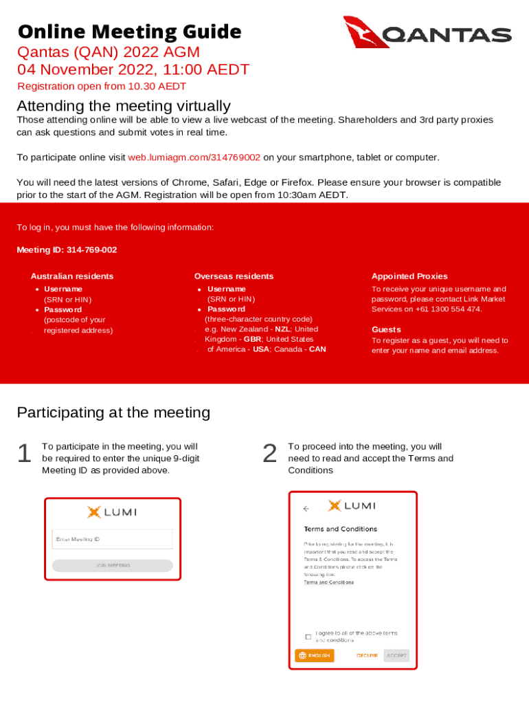 Online Meeting GuideQantas (QAN) 2022 AGM 04 November 2022, 11:00 AEDT Registration open from 10.30 AEDTAttending the meeting virtually Those attending online will be able to view a live webcast of