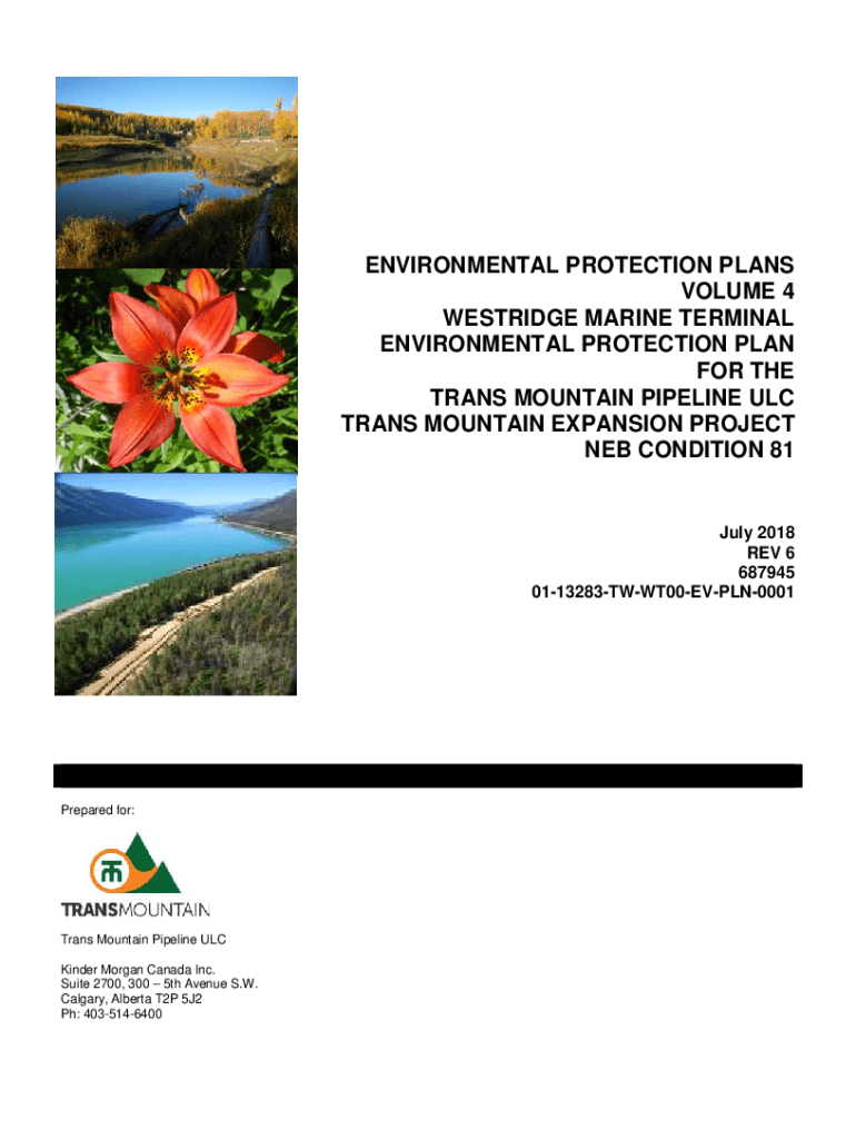 ENVIRONMENTAL PROTECTION PLANS VOLUME 4 WESTRIDGE MARINE TERMINAL ENVIRONMENTAL PROTECTION PLAN FOR THE TRANS MOUNTAIN PIPELINE ULC TRANS MOUNTAIN EXPANSION PROJECT NEB CONDITION 81July 2018 REV 6