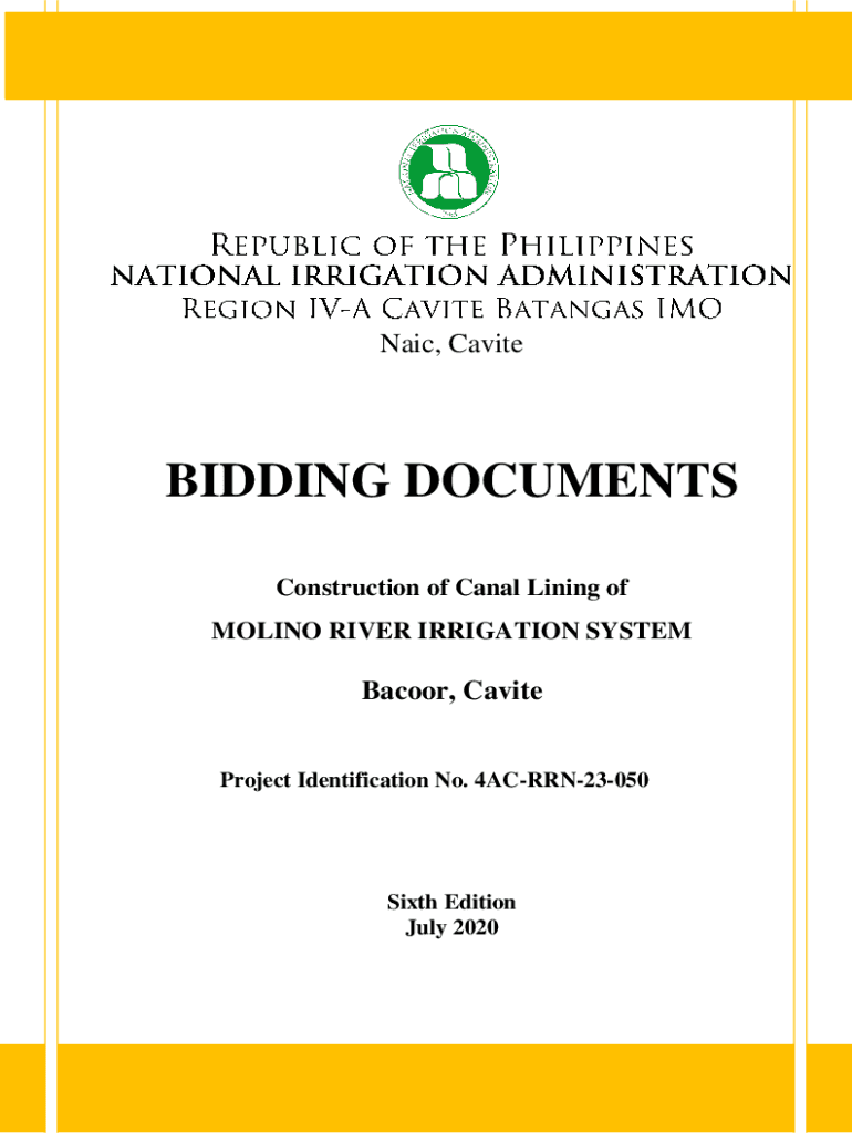 Naic, CaviteBIDDING DOCUMENTS Construction of Canal Lining of MOLINO RIVER IRRIGATION SYSTEMBacoor, Cavite Project Identification No. 4ACRRN23050Sixth Edition July 2020TABLE OF CONTENTSGLOSSARY OF
