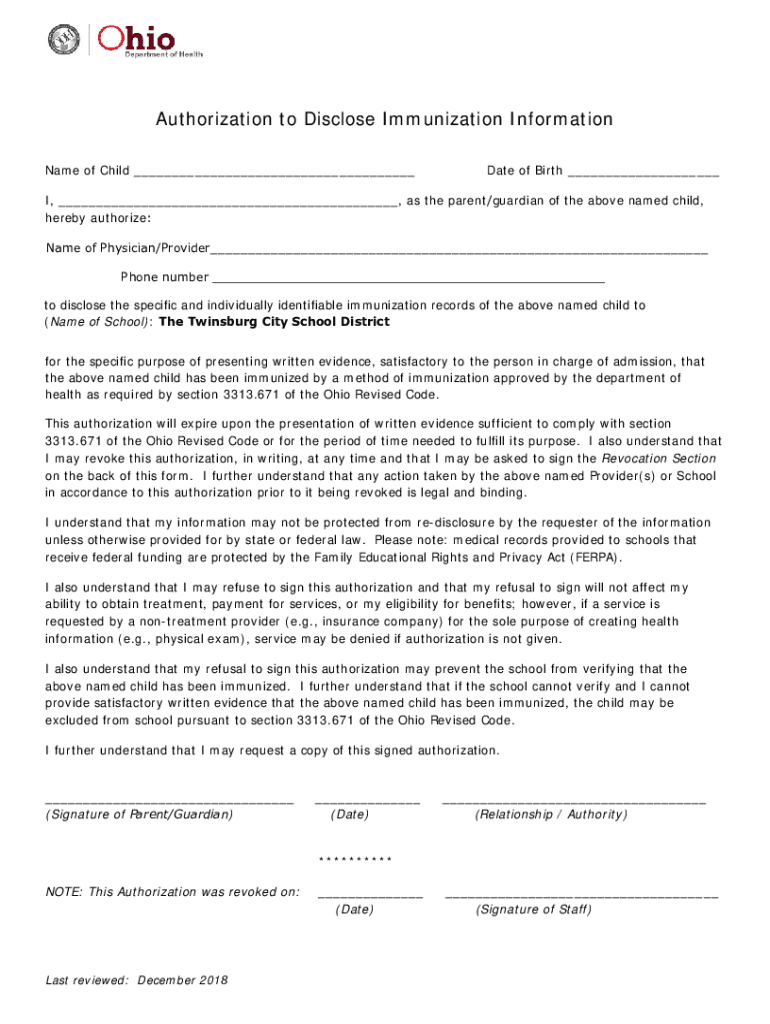 Authorization to Disclose Immunization Information Name of Child ___Date of Birth ___I, ___, as the parent/guardian of the above named child, hereby authorize: Name of Physician/Provider___ Phone