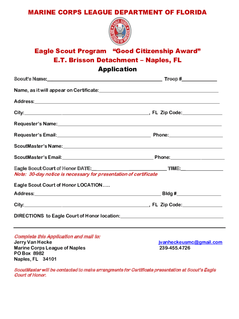 MARINE CORPS LEAGUE DEPARTMENT OF FLORIDAEagle Scout Program Good Citizenship Award E.T. Brisson Detachment Naples, FL Application Scouts Name:___ Troop #___ Name, as it will appear on Certificate:___