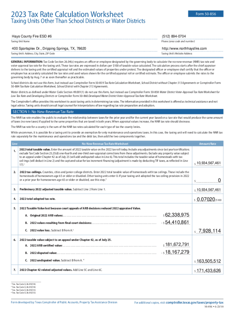 2023 Tax Rate Calculation WorksheetForm 50856Taxing Units Other Than School Districts or Water Districts Hays County Fire ESD #6 ___ Taxing Unit Name(512) 8940704 ___Phone (area code and number)400