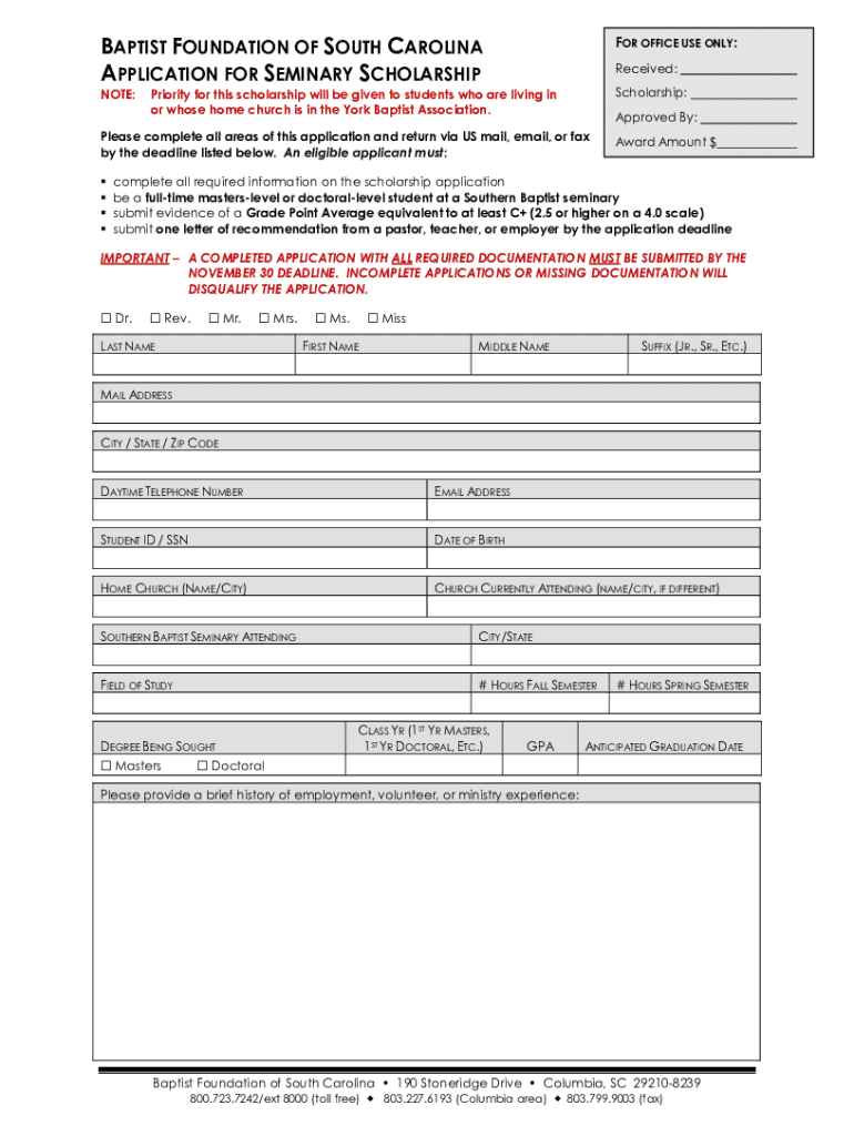 BAPTIST FOUNDATION OF SOUTH CAROLINA APPLICATION FOR SEMINARY SCHOLARSHIP NOTE:FOR OFFICE USE ONLY: Received: Scholarship:Priority for this scholarship will be given to students who are living in