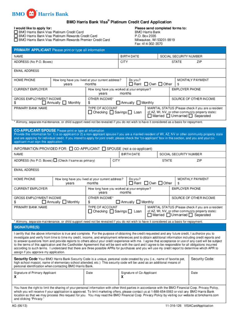 CLEAR FORMBMO Harris Bank Visa Platinum Credit Card Application I would like to apply for: BMO Harris Bank Visa Platinum Credit Card BMO Harris Bank Visa Platinum Rewards Credit Card BMO Harris Bank
