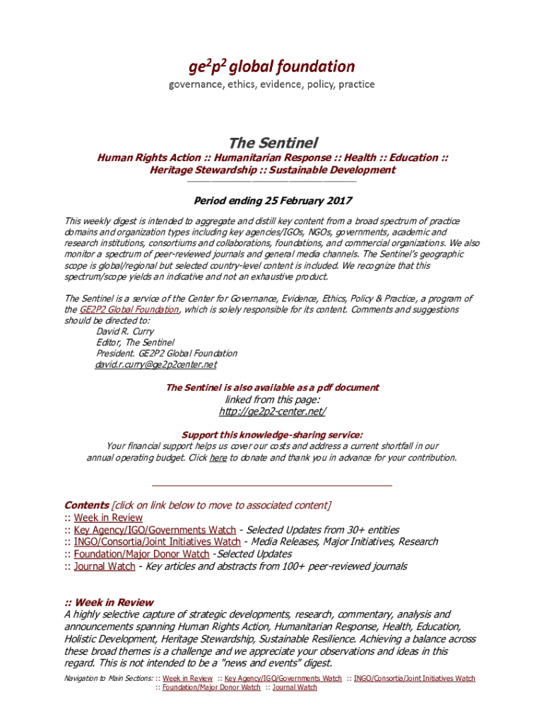 The SentinelHuman Rights Action :: Humanitarian Response :: Health :: Education :: Heritage Stewardship :: Sustainable Development ___Period ending 25 February 2017 This weekly digest is intended