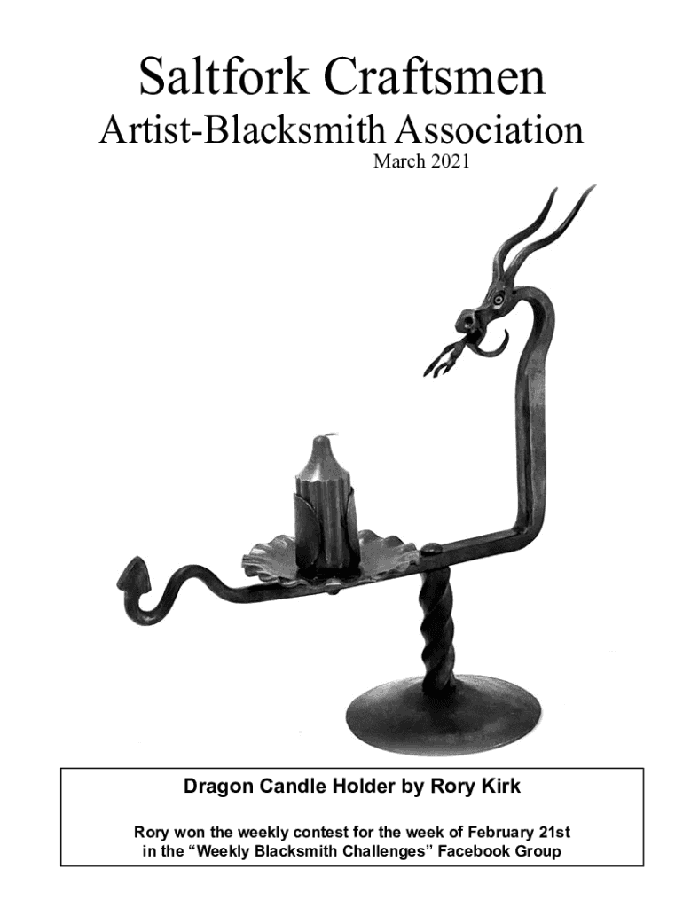 Saltfork CraftsmenArtistBlacksmith AssociationMarch2021Dragon Candle Holder by Rory Kirk Rory won the weekly contest for the week of February 21st in the Weekly Blacksmith Challenges Facebook GroupSaltfork
