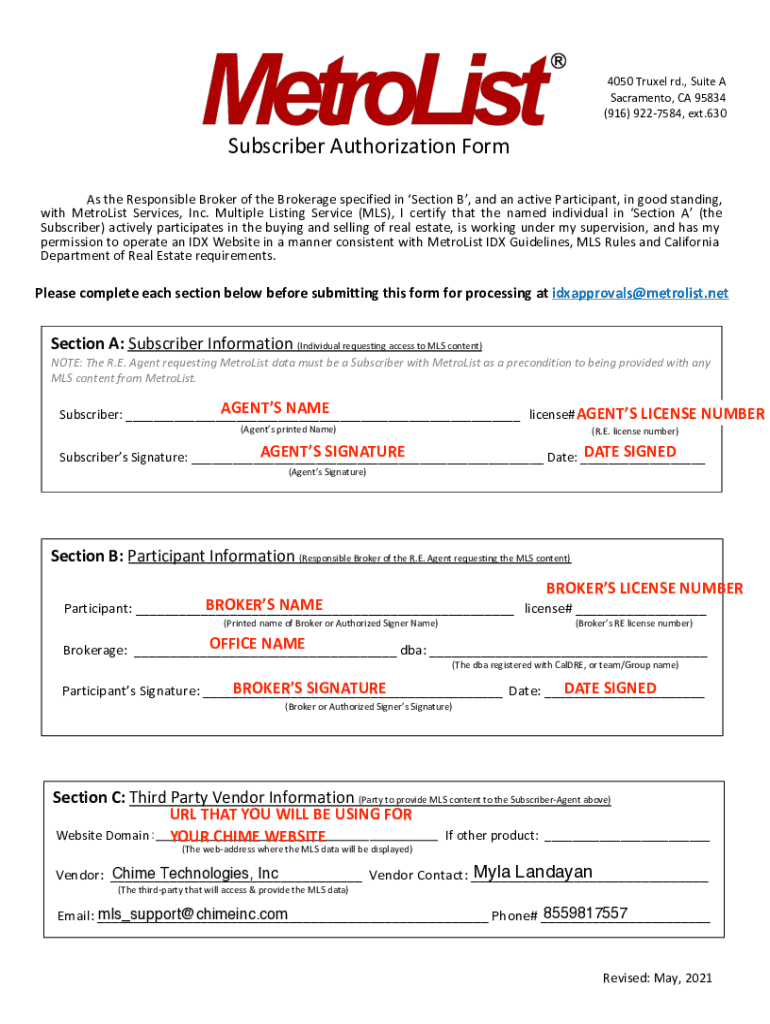 4050 Truxel rd., Suite A Sacramento, CA 95834 (916) 9227584, ext.630Subscriber Authorization Form As the Responsible Broker of the Brokerage specified in Section B, and an active Participant, in good