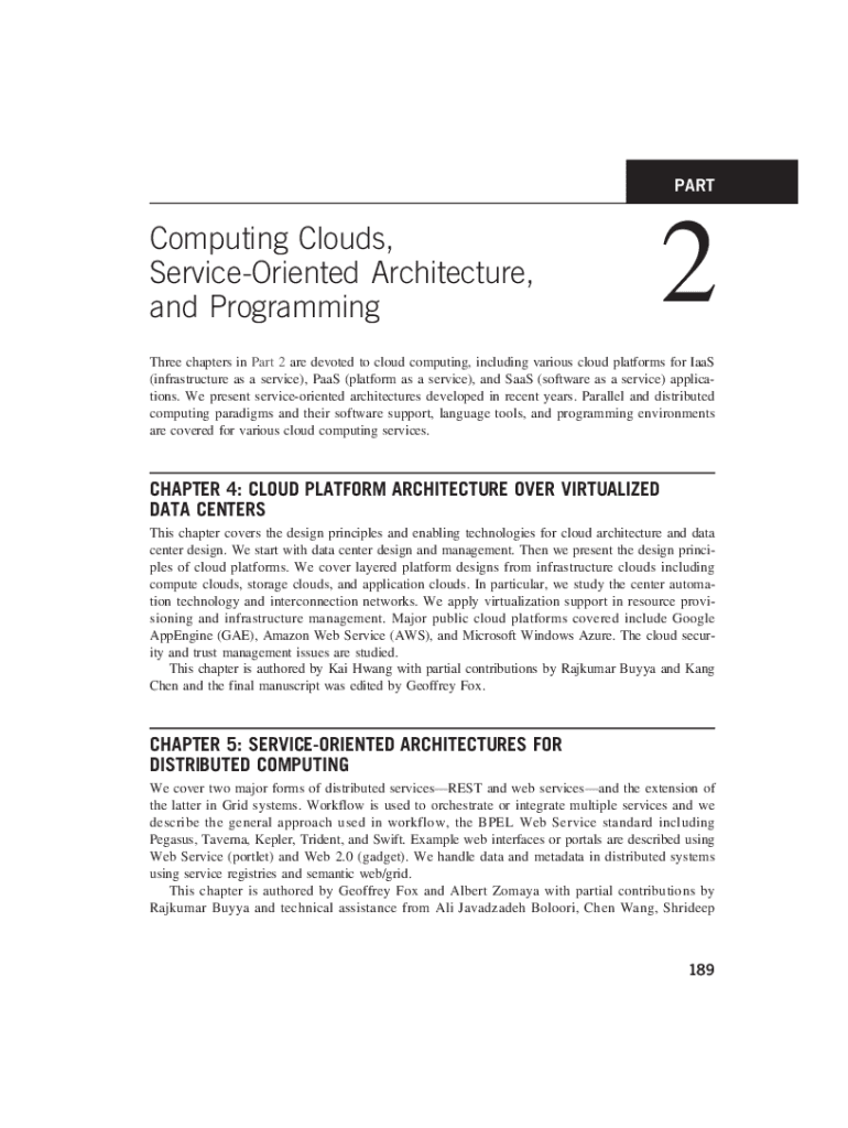 PARTComputing Clouds, ServiceOriented Architecture, and Programming2Three chapters in Part 2 are devoted to cloud computing, including various cloud platforms for IaaS (infrastructure as a service),