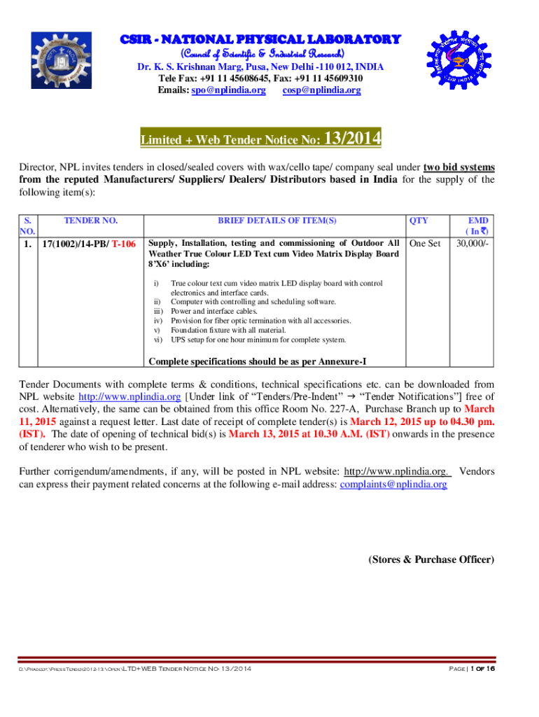 CSIR NATIONAL PHYSICAL LABORATORY (Council of Scientific & Industrial Research) Dr. K. S. Krishnan Marg, Pusa, New Delhi 110 012, INDIA Tele Fax: +91 11 45608645, Fax: +91 11 45609310 Emails: spo@nplindia.org