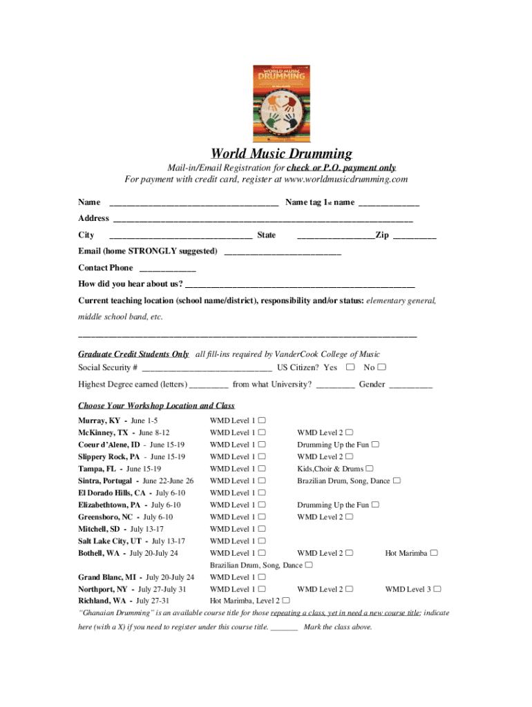 World Music Drumming Mailin/Email Registration for check or P.O. payment only For payment with credit card, register at www.worldmusicdrumming.com Name___ Name tag 1st name ___Address ___ City___
