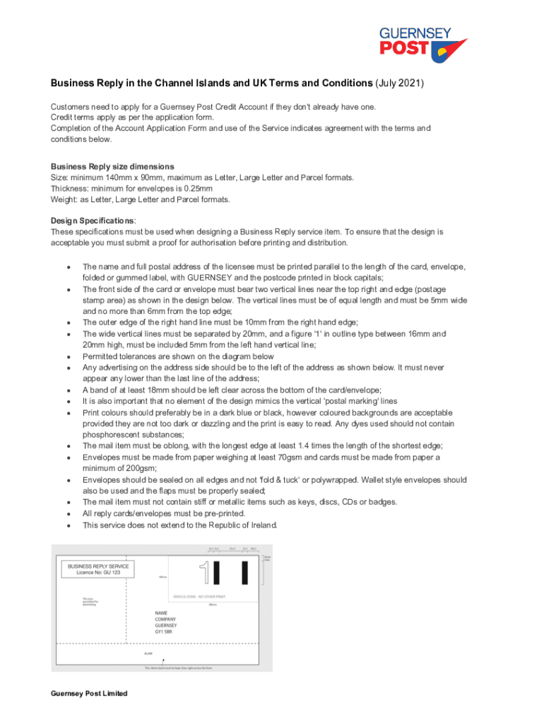 Business Reply in the Channel Islands and UK Terms and Conditions (July 2021) Customers need to apply for a Guernsey Post Credit Account if they don\'t already have one. Credit terms apply as per