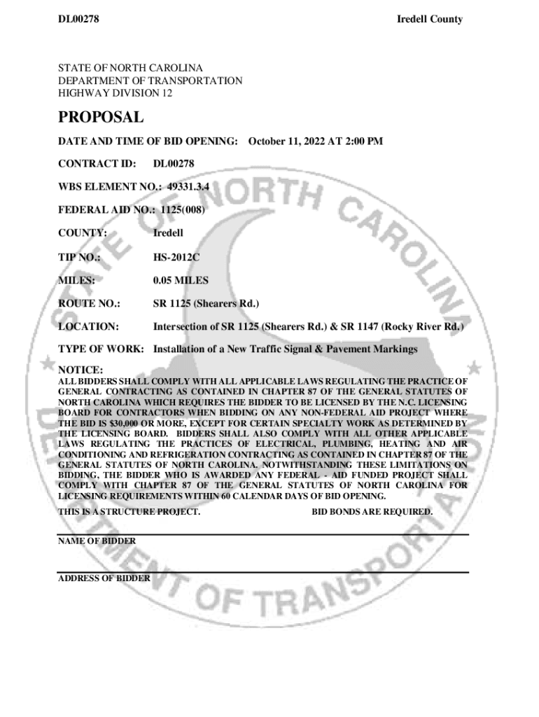 DL00278Iredell CountySTATE OF NORTH CAROLINA DEPARTMENT OF TRANSPORTATION HIGHWAY DIVISION 12PROPOSAL DATE AND TIME OF BID OPENING: October 11, 2022 AT 2:00 PM CONTRACT ID:DL00278WBS ELEMENT NO.: