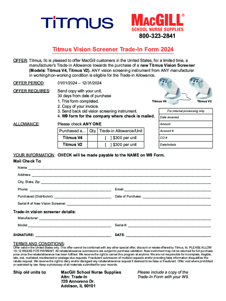 8003232841 Titmus Vision Screener TradeIn Form 2024 OFFER: Titmus, llc is pleased to offer MacGill customers in the United States, for a limited time, a manufacturers Tradein Allowance towards the