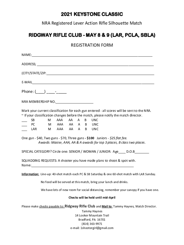 2021 KEYSTONE CLASSIC NRA Registered Lever Action Rifle Silhouette Match RIDGWAY RIFLE CLUB MAY 8 & 9 (LAR, PCLA, SBLA) REGISTRATION FORM NAME:___ ADDRESS; ___ (CITY/STATE/ZIP:___ EMAIL___Phone: (___)