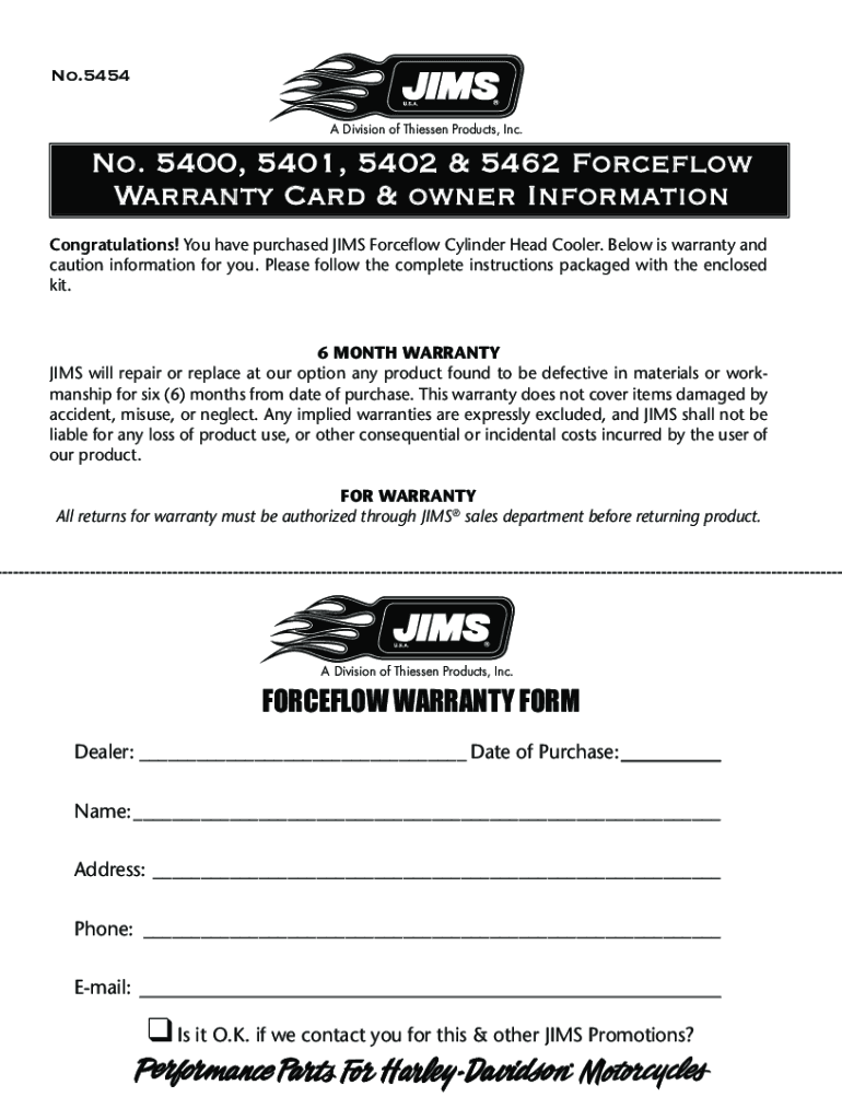 No.5454 A Division of Thiessen Products, Inc.No. 5400, 5401, 5402 & 5462 Forceflow Warranty Card & owner Information Congratulations! You have purchased JIMS Forceflow Cylinder Head Cooler. Below