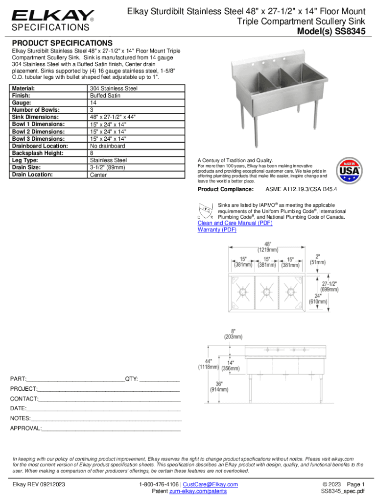 Elkay Sturdibilt Stainless Steel 48\" x 271/2\" x 14\" Floor Mount Triple Compartment Scullery Sink Model(s) SS8345SPECIFICATIONS PRODUCT SPECIFICATIONSElkay Sturdibilt Stainless Steel 48\" x 271/2\"
