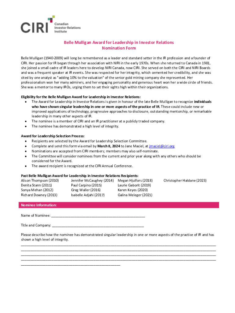 Belle Mulligan Award for Leadership in Investor Relations Nomination Form Belle Mulligan (19402009) will long be remembered as a leader and standard setter in the IR profession and a founder of CIRI.